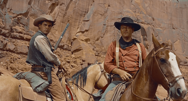 Ethan’s family is murdered by Comanche and he vows to save the two women they abduct. He gives chase and stays on their trail for several years, with only his adopted nephew by his side. Martin Pawley, the nephew, is one-eighth Cherokee and Wayne’s character consistently uses slurs and insults him through the movie. It would be worth commenting on, but it’s pretty small in comparison to Ethan’s larger ethos.